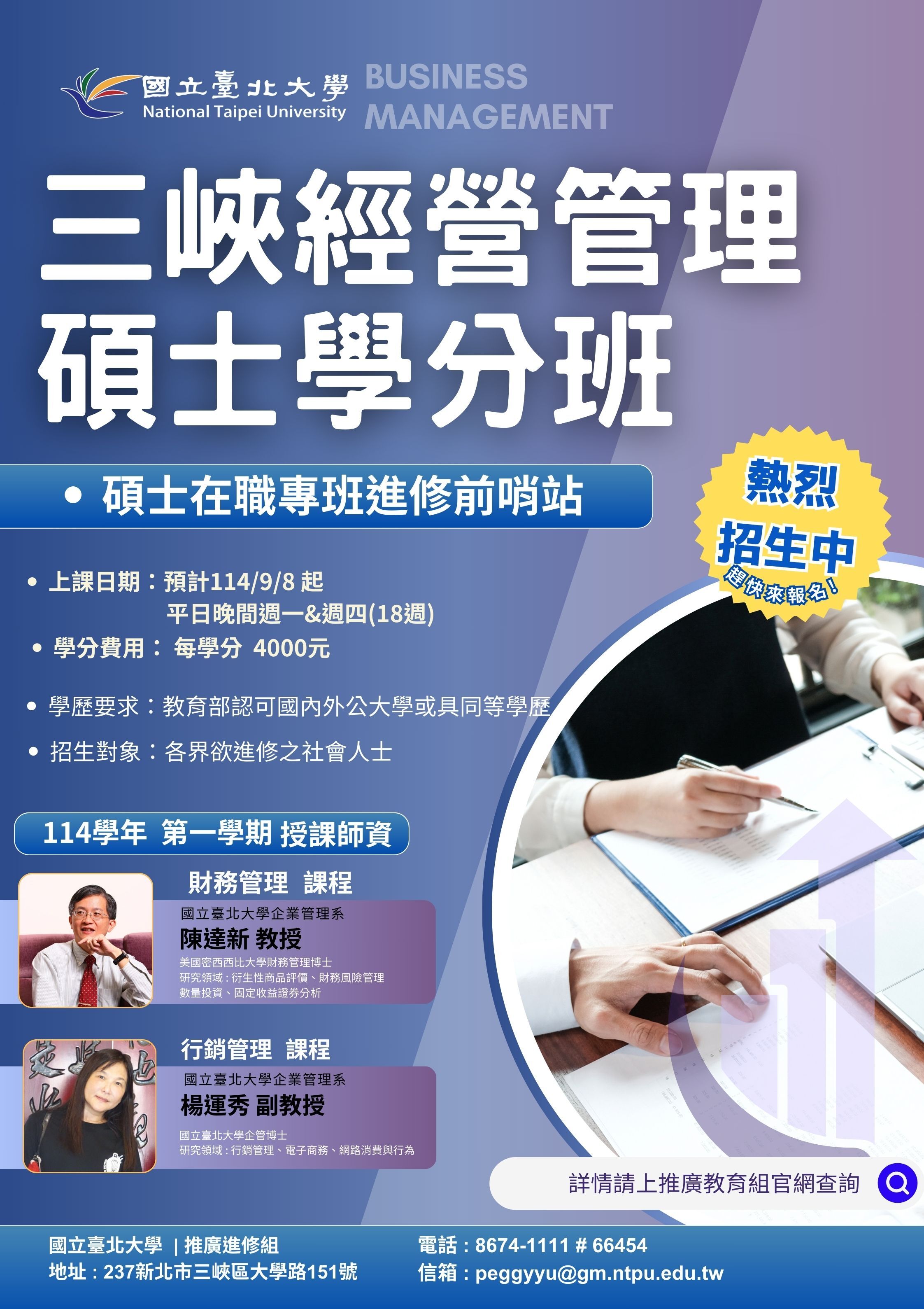 檢送【經營管理碩士學分班】課程資訊,本課程延長招生至114年8月15日,敬邀報名參加,以強化專業管理能力及銜接EMBA課程,請查照。